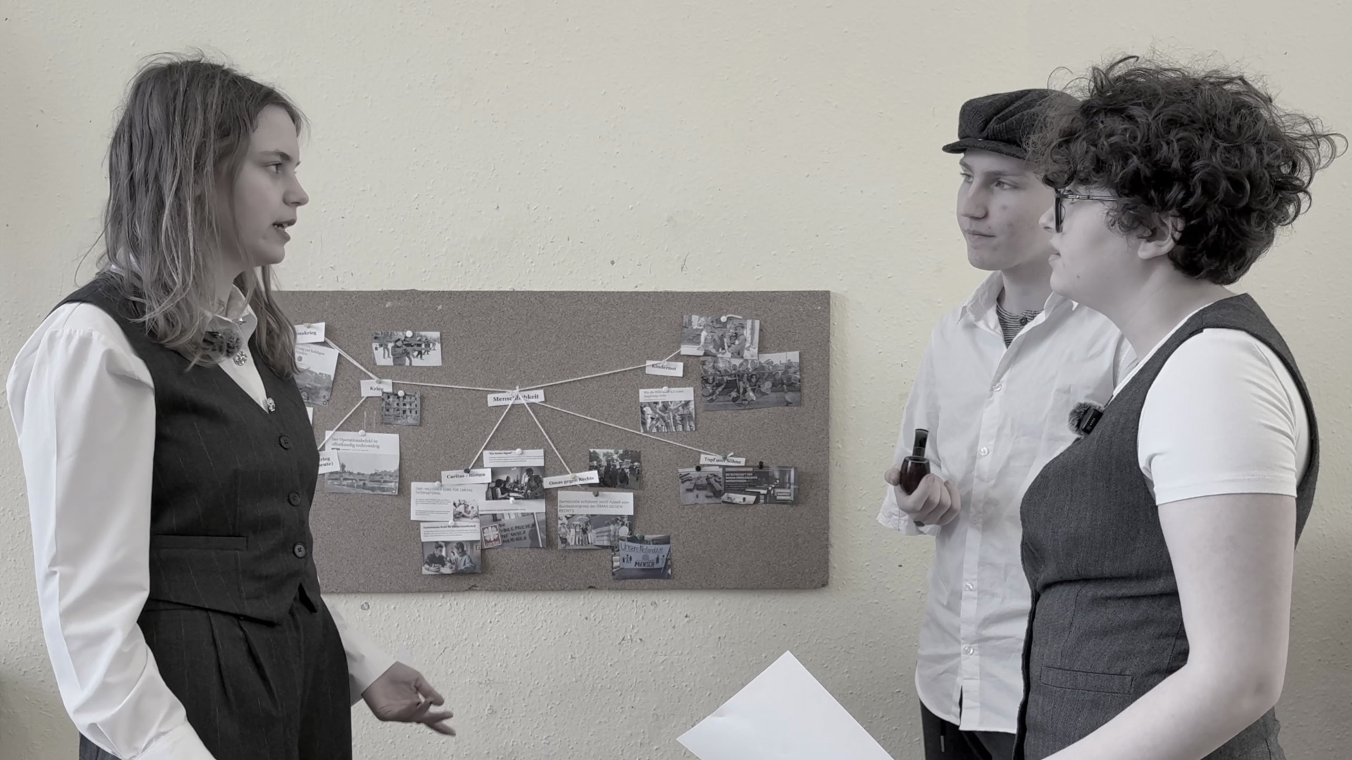Unsere Gruppe beschäftigt sich mit der „Suche nach der Menschlichkeit“, inspiriert vom Geschichtsunterricht zum Dritten Reich und dessen Spuren in Erfurt. Im Zentrum steht eine fiktive Spurensuche dreier Detektive, die von einem anonymen Auftraggeber „H.M.“ Hinweise erhalten. Ausgehend von der Frage „Gibt es nicht doch Menschlichkeit?“ gliedert sich das Video in drei Teile: Problemaufriss, Suche und Fazit.